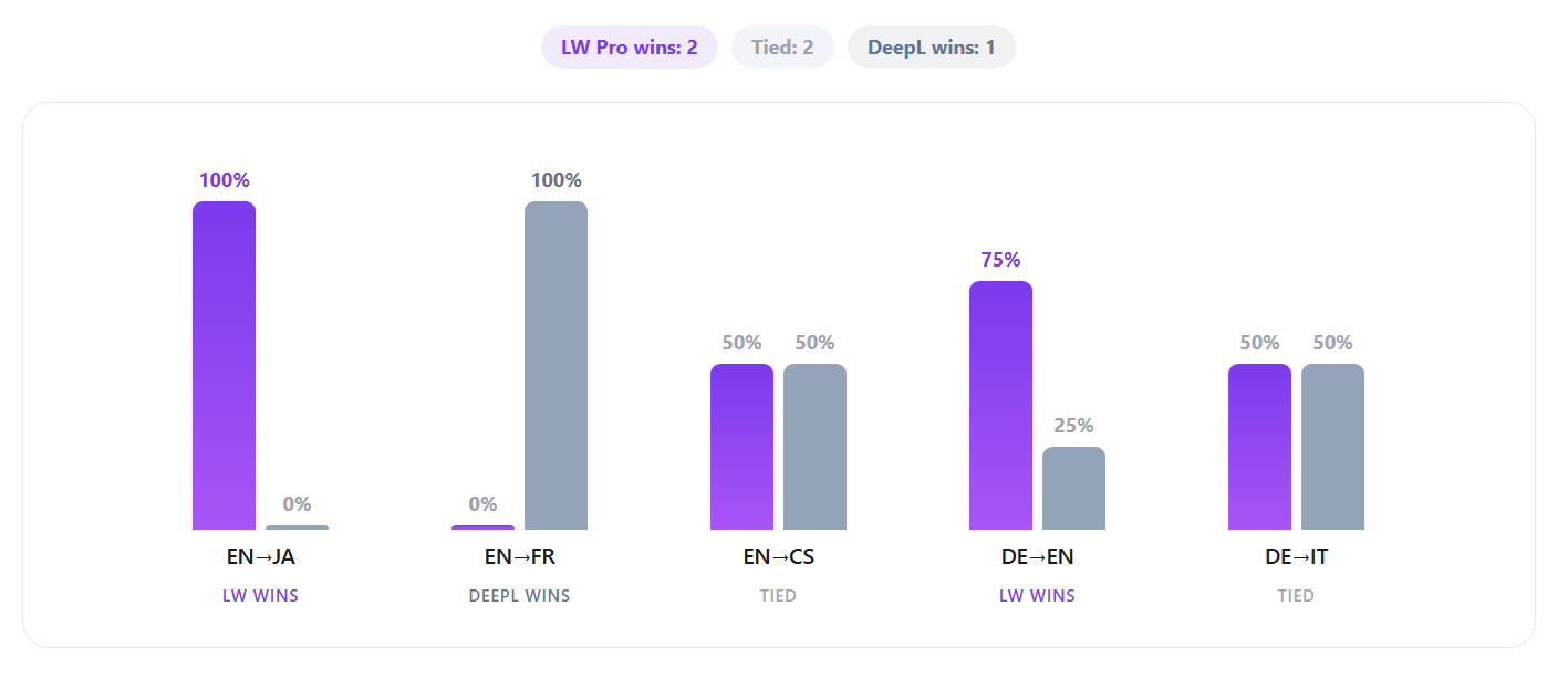 Evaluated against the world's leading AI translation systems across 32 languages, 2 domains, and 2 content types