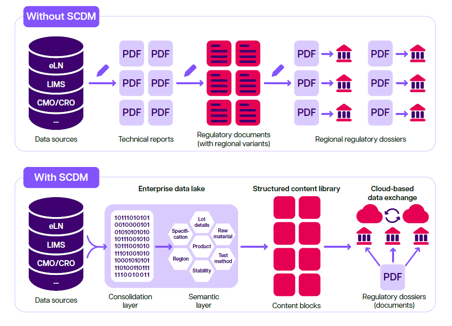 Comparison of regulatory submission processes with and without SCDM. A comparison of regulatory CMC submission assembly and dispatch is shown. Without SCDM, data is manually transcribed from the source into a technical report. The technical report is then used as a source document for a regulatory document, of which there are multiple regional variants created manually. Compilations of documents are then sent individually to health authorities for review, requiring the company to maintain multiple regional dossier variants. With SCDM, manual authoring steps can be reduced or eliminated as content and data can be taken directly from the source system, processed and semantically mapped via an enterprise data lake, and made available for incorporation in a regulatory filing via the structured content and data library, which is made up of content blocks. The content blocks can be reorganized, updated, and customized according to regulatory objectives and regional filing needs. The structured content and data library can achieve flexible output options, including electronic data submission, cloud-based information transfer, and printable paper-based filings.