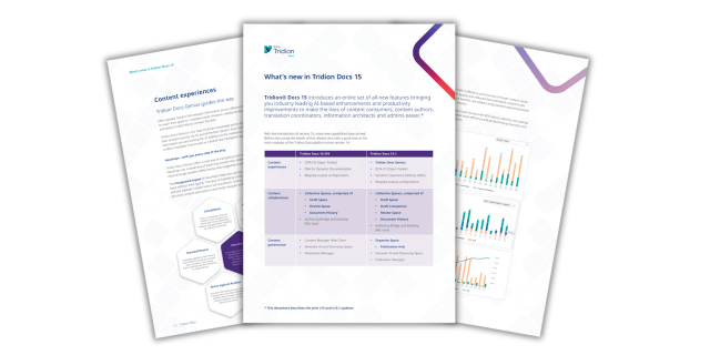 Notre dernière version de Tridion Docs offre des améliorations de pointe basées sur l'IA et des améliorations de productivité pour les consommateurs et les auteurs de contenu, les coordinateurs de traduction, les architectes d'informations et les administrateurs.